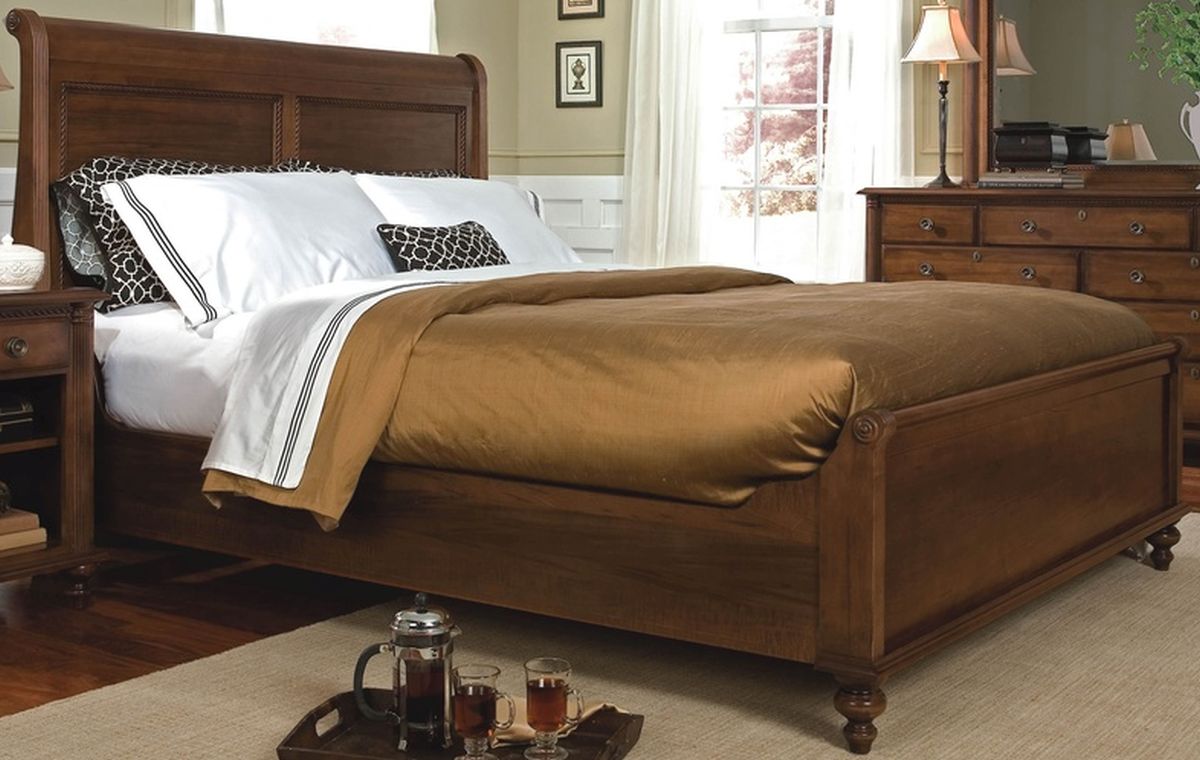 Savile row queen sleigh bed in barley finish. Made of solid wormy maple wood.Read More