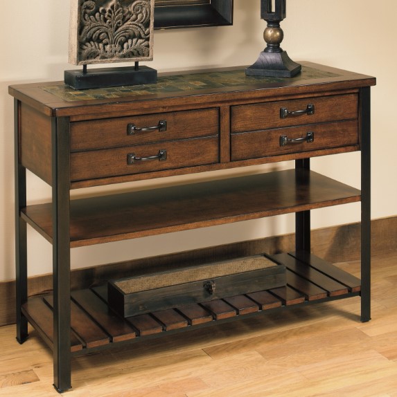 This collection is comprised of five tables with plenty of storage and function designed into each piece. The cherry veneer is expertly finished with an aged tobacco finishing process that is further enhanced by natural slate tile tops and antique bronze metal legs and hardware. The slatted shelves on selected pieces only add to the style and function of this group to offer a major occasional fashion option to any consumer.