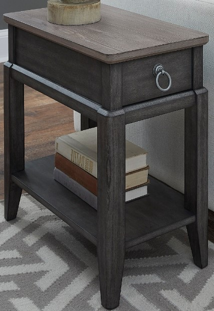 Introducing the stylish Lake Lure Chairside End Table! Constructed of oak solids, catalpa (walnut) veneer, and high-pressure laminate on the tops. This table has a two-tone finish; the bases are gray fog while the tops are cathedral gray. The ring pull hardware has a pewter finish.Read More