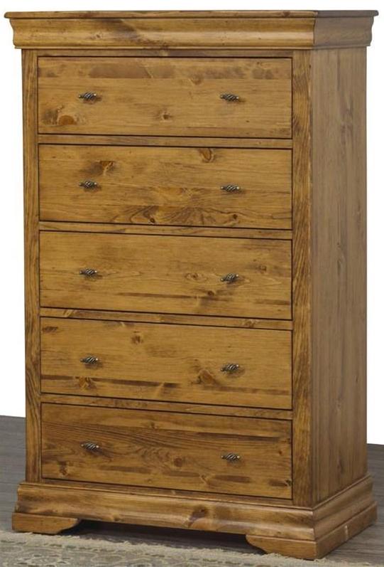 This charming Louis Rustique 5-Drawer Chest provides plenty of storage with its five drawers. It is adorned with decorative mouldings and stands on bracket feet.